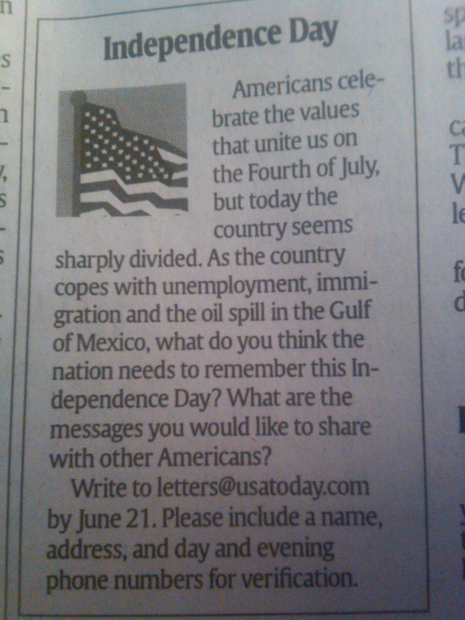 Last week we wrote about an item that appeared in USA Today wanting to know your opinion about the meaning and significance of Independence Day: