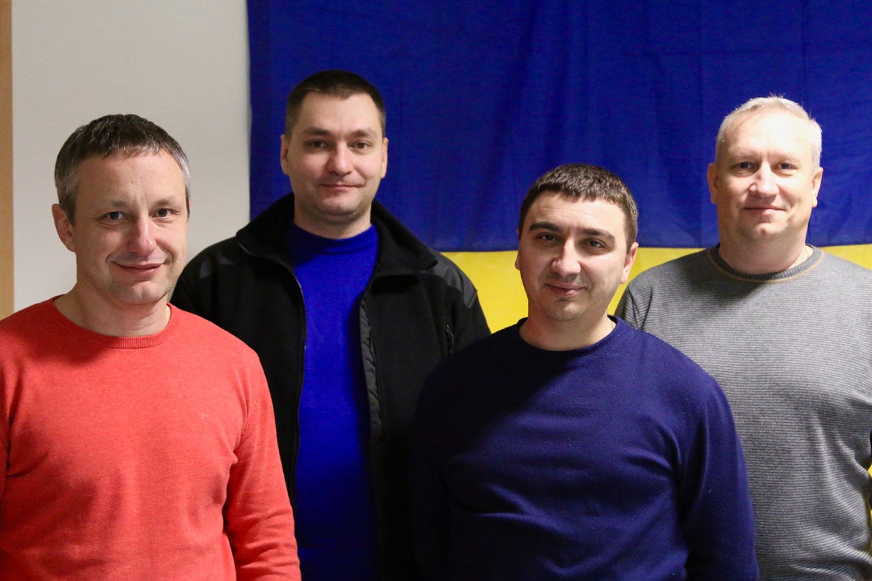 From left to right: Petro Andryushchenko, Roman Amelyakin, Kyrylo Vyshnyakov, and Oleh Kharchenko—all civil society activists in Mariupol.