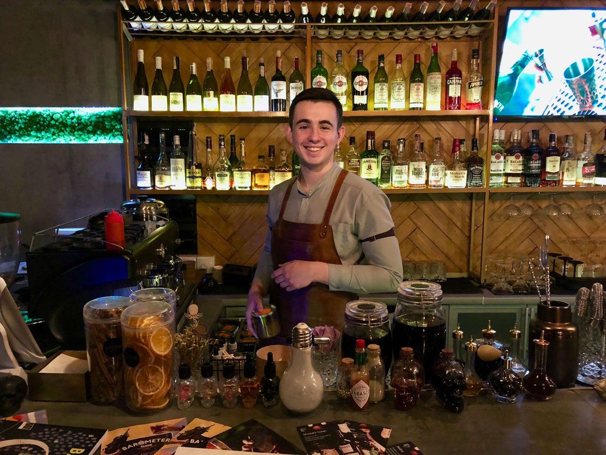 Then you turn down University Street and make your way to the Stone Restobar. This modern restaurant opened after the war began. It has a smart interior, eclectic menu, and excellent craft cocktails. Behind the bar, 19-year-old barman Nikita Skidkov is quick to make his trademark drink, the brandy-based “Trader.”