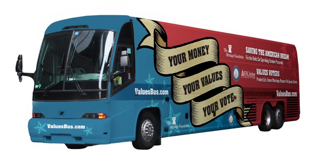 That’s why today The Heritage Foundation and the Family Research Council (FRC) are proud to embark on a bus tour designed to tell Americans about practical, conservative solutions to the most critical issues confronting the nation. With a banner proclaiming “Your Money, Your Values, Your Vote,” our Values Bus will roll into Charleston, South Carolina, this morning for our first event outside TD Arena at the College of Charleston. And we’ll be joined by a very special guest — South Carolina Governor Nikki Haley. From there, the bus tour will roll on until the November 6 presidential election.