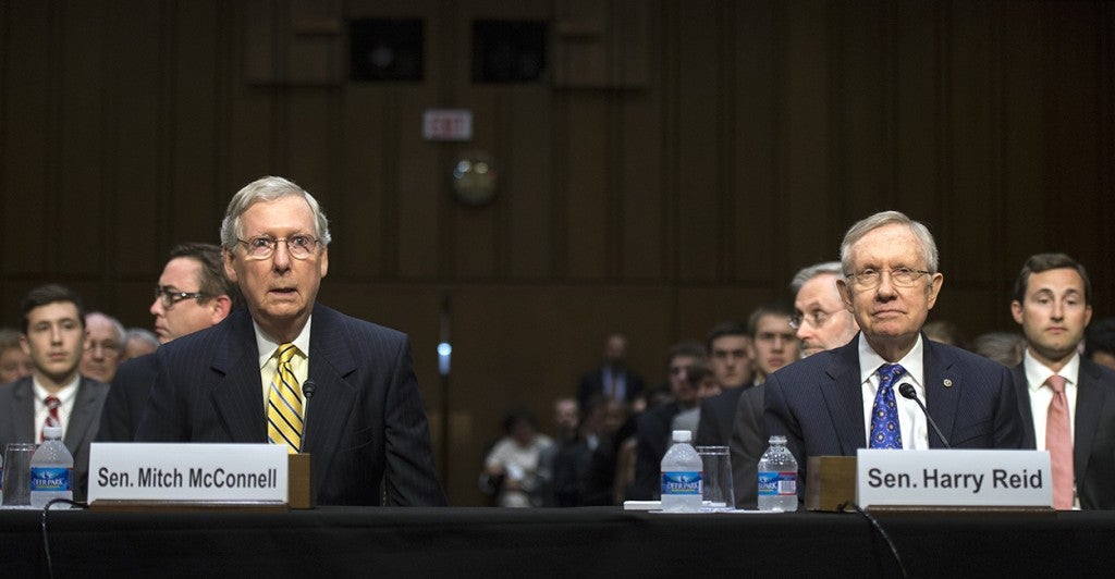 Senate Minority Leader Mitch McConnell (R-Ky.) and Senate Majority Leader Harry Reid (D-Nev.) testify during a Senate Judiciary Committee hearing on a constitutional amendment on campaign finance. (Photo: UPI/Newscom)