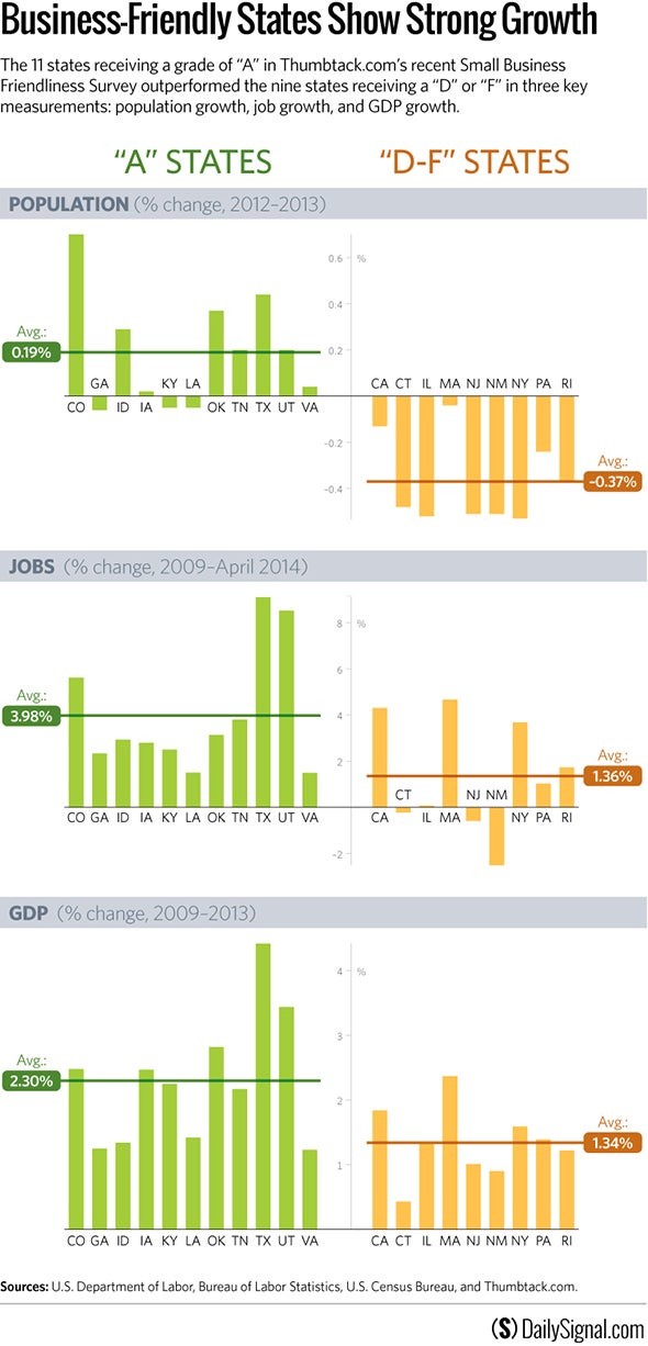 The “A” states, on the other hand, experienced 3.98 percent jobs growth on average—a rate nearly triple that of the least small-business friendly states. And what about the compounded real GDP growth from 2009-2013? The most hostile states grew an average of just 1.34 percent a year. The business-friendly states grew an average of 2.3 percent a year.