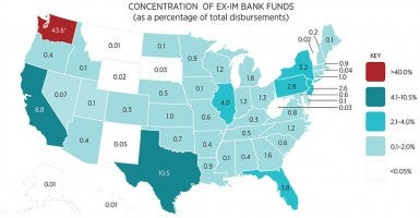 Using public data from the Export-Import Bank, a researcher at George Mason University analyzed the proportion of the federal agency’s disbursements each state received over the past seven years.