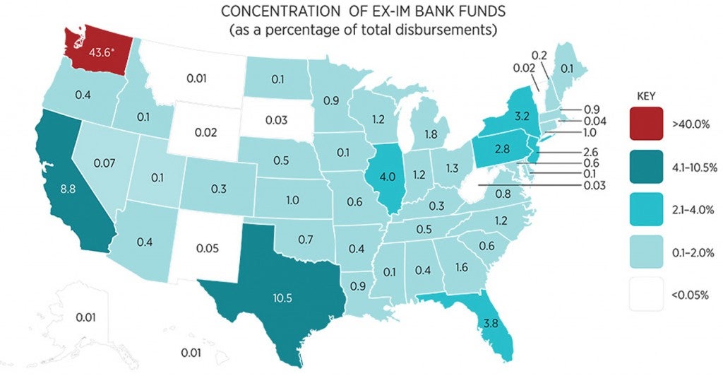 Using public data from the Export-Import Bank, a researcher at George Mason University analyzed the proportion of the federal agency’s disbursements each state received over the past seven years.