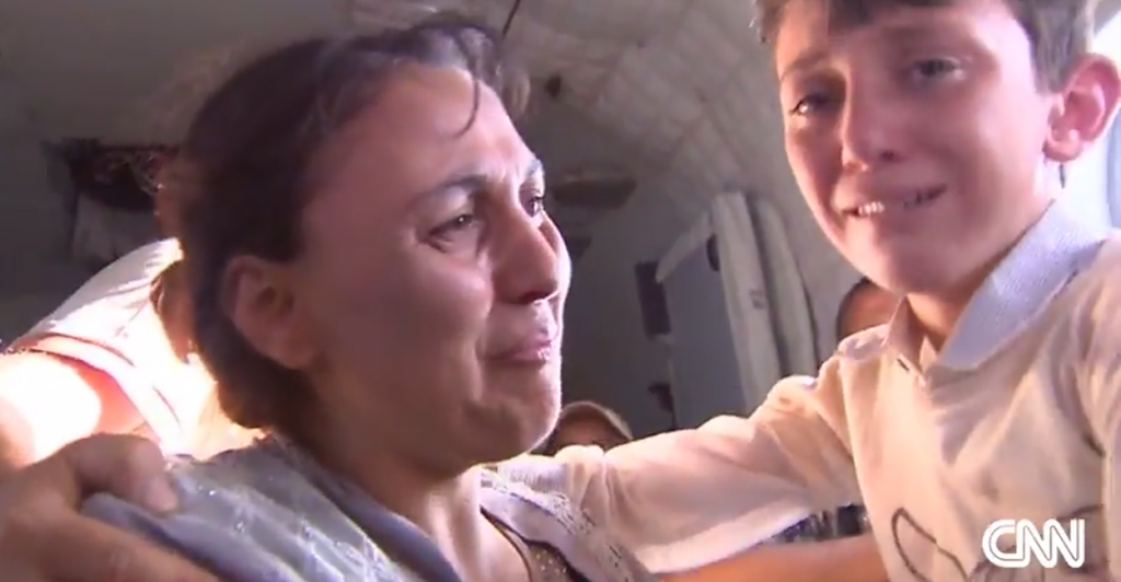 CNN photojournalist Mark Phillips was on board a flight taking supplies to the Yezidi community trying to escape Islamic State fighters in Mount Sinjar, Iraq. His raw footage captures the emotional rescue by the Iraqi air force and Kurdish peshmerga. “There was not a dry eye on the aircraft,” CNN reported.