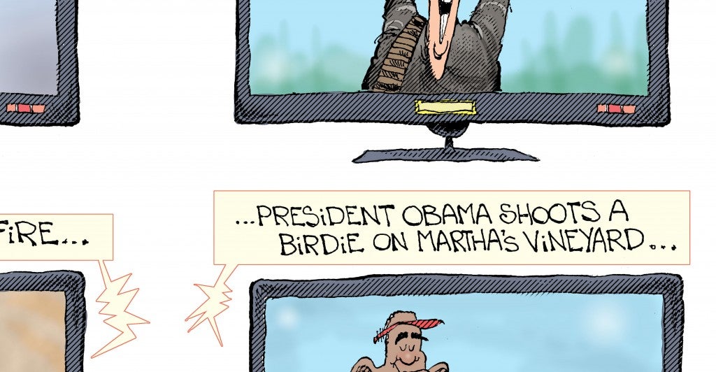 Cartoon: What Obama Does as Countries Explode Glenn Foden 11 years ago Which news story seems out of place? Related posts: A Prayer for Our Nation The Media Aggressively Plays Dumb on the Liberal Hate of Kirk’s Killer