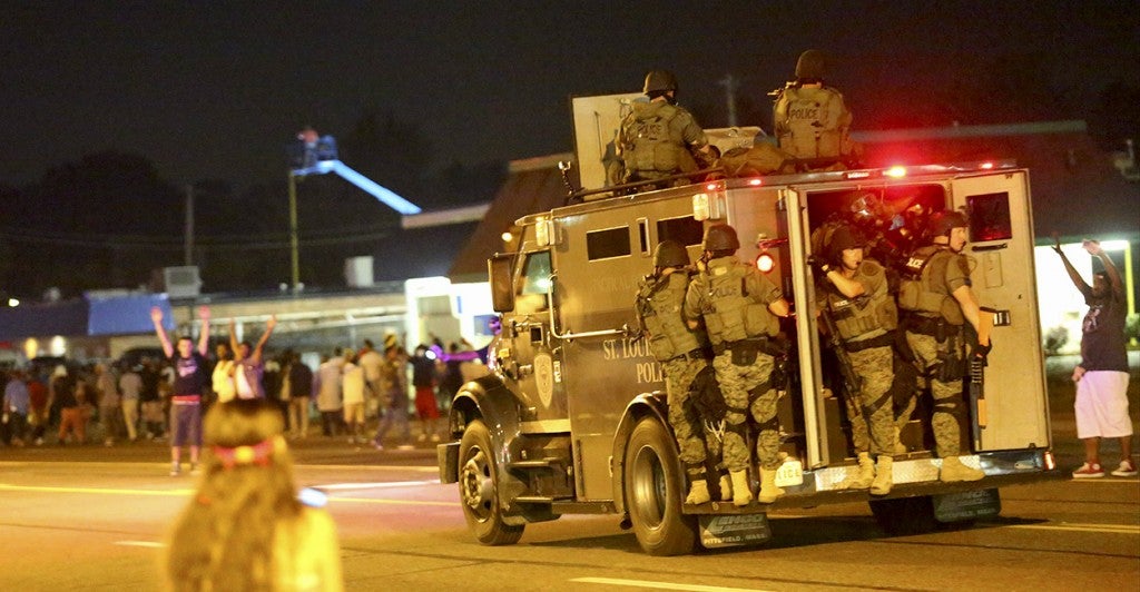 Images on TV, online and in print have depicted rows of law enforcement officers wearing heavy body armor and accompanied by armored vehicles as they respond to protests, violence and vandalism. Some onlookers argue that police officers look as if they’re in a war zone, not in the streets of a town of 21,000.