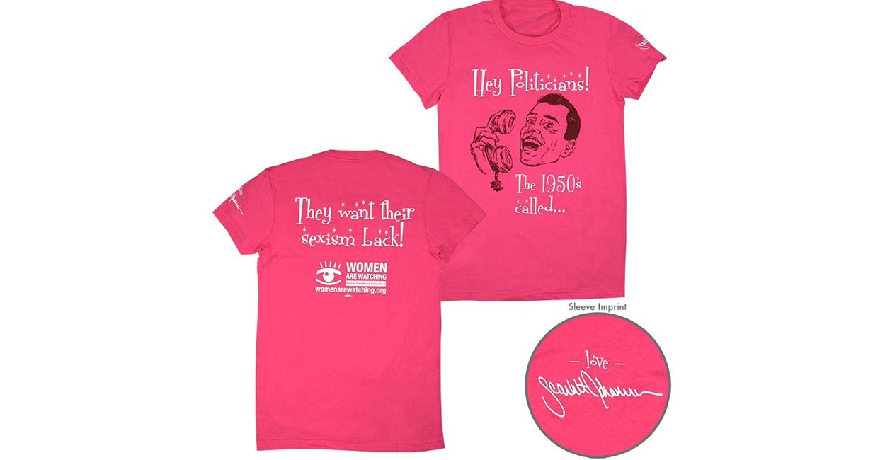 The front of the pink t-shirt reads “Hey Politicians! The 1950s called…” and the back reads, “They want their sexism back!”
