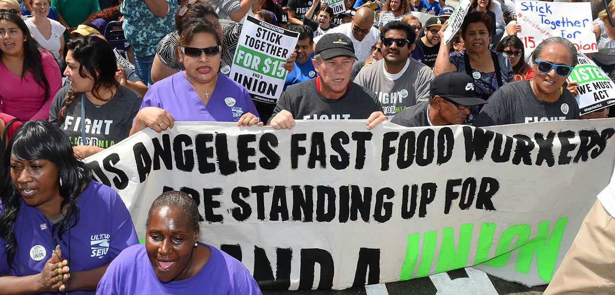 SEIU President Mary Kay Henry rallied with fast-food workers in California, promising the union’s support: “We are going to fight with you until you win $15 in a union from McDonald’s, Wendy’s, Burger King and this entire industry.”