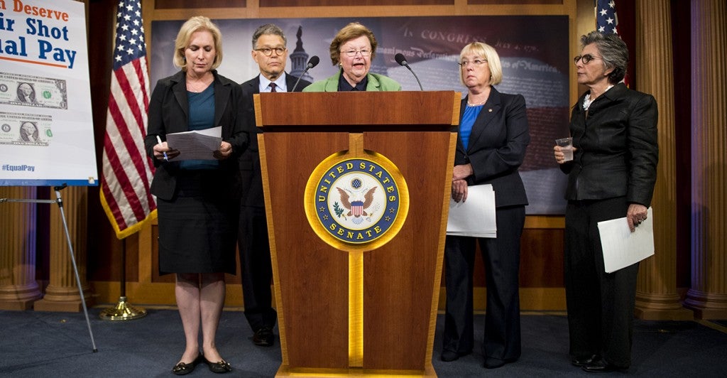 From left, Sens. Kirsten Gillibrand, D-N.Y., Al Franken, D-Minn., Barbara Mikulski, D-Md., Patty Murray, D-Wash., and Barbara Boxer, D-Calif., participate in the Senate Democrats' news conference after the Senate's vote on the 'Paycheck Fairness Act' on Wednesday. (Photo: Bill Clark/CQ Roll Call)