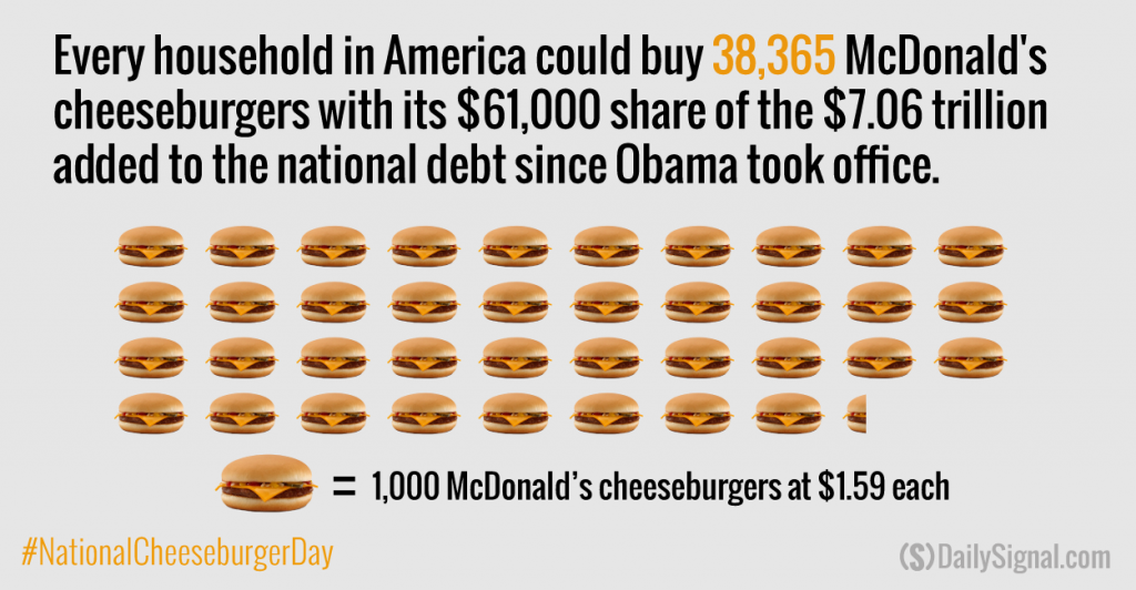 It’s Sept. 2014 and the country is $17.6 trillion in debt. In Jan. 2009, when President Obama was inaugurated, the nation’s debt was $10.6 trillion. Yes, the United States has added $7.06 trillion of debt under Obama. That breaks down to $61,000 per American household — and roughly 38,365 $1.59 cheeseburgers from McDonald’s. Ouch.