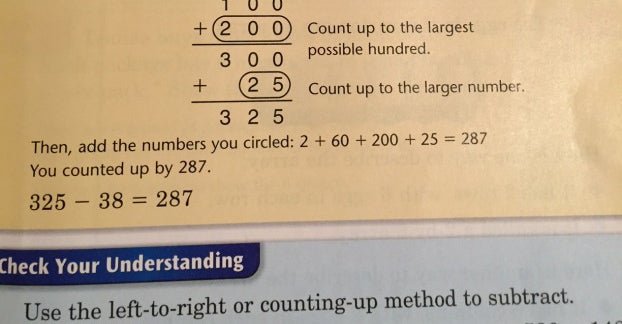 According to this third-grade textbook, students must take about six steps (at minimum, depending how you count) to subtract just two numbers. And if you don't show your work, circle the right numbers and "count up" correctly, you haven't proven that you've mastered the "why" of the problem.