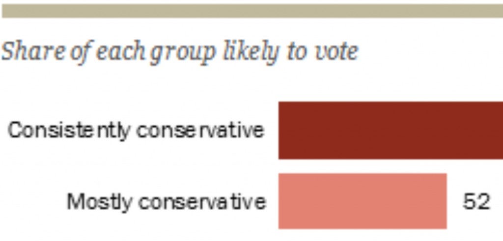 Seventy-three percent of respondents who said they are “consistently conservative,” and 52 percent of those who are “mostly conservative” reported that they are likely to vote in the election.