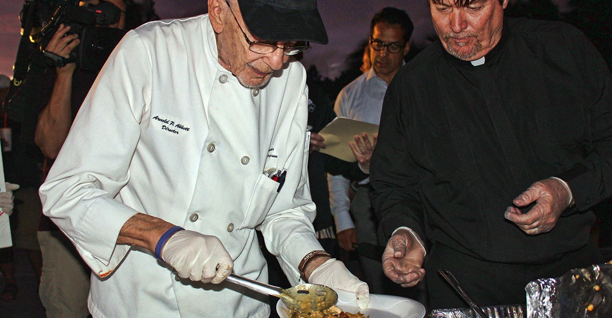 Arnold Abbott runs a non-profit charity called Love Thy Neighbor, Inc., which seeks to care for the homeless population in the Fort Lauderdale area. Abbott is a World War II veteran, who was awarded two Purple Hearts as an infantryman. He dedicates his charity in memory of his late wife, Maureen.