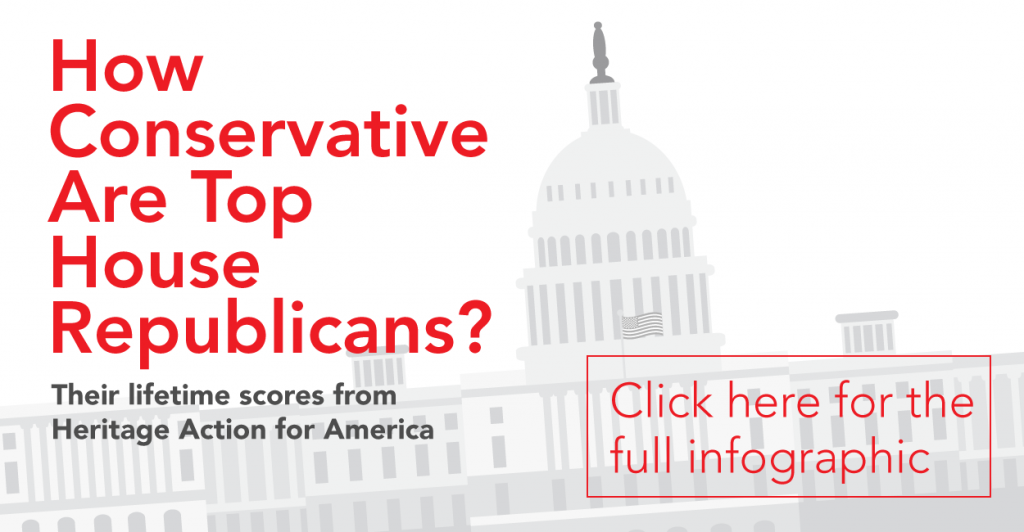 Republicans may control the Senate as well as the House come January,  but that doesn’t guarantee conservative leadership. Pulling from lifetime scores by Heritage Action for America, this infographic ranks the new lineup of House leaders by their conservative (or not-so-conservative) voting records.