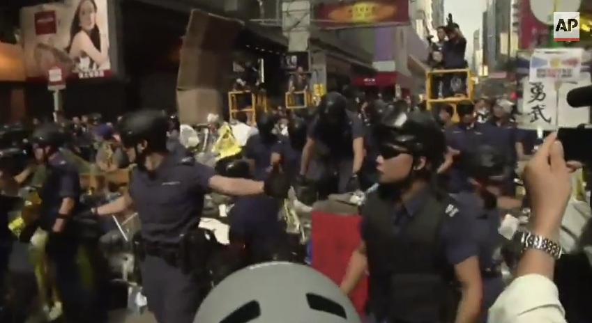 The site cleared was in Mong Kok, a working-class area where Beijing-controlled mafia groups known as Triads have violently attacked the peaceful protesters in the past two months. Among those arrested were student leaders Joshua Wong and Lester Shum, 17 and 21 respectively.