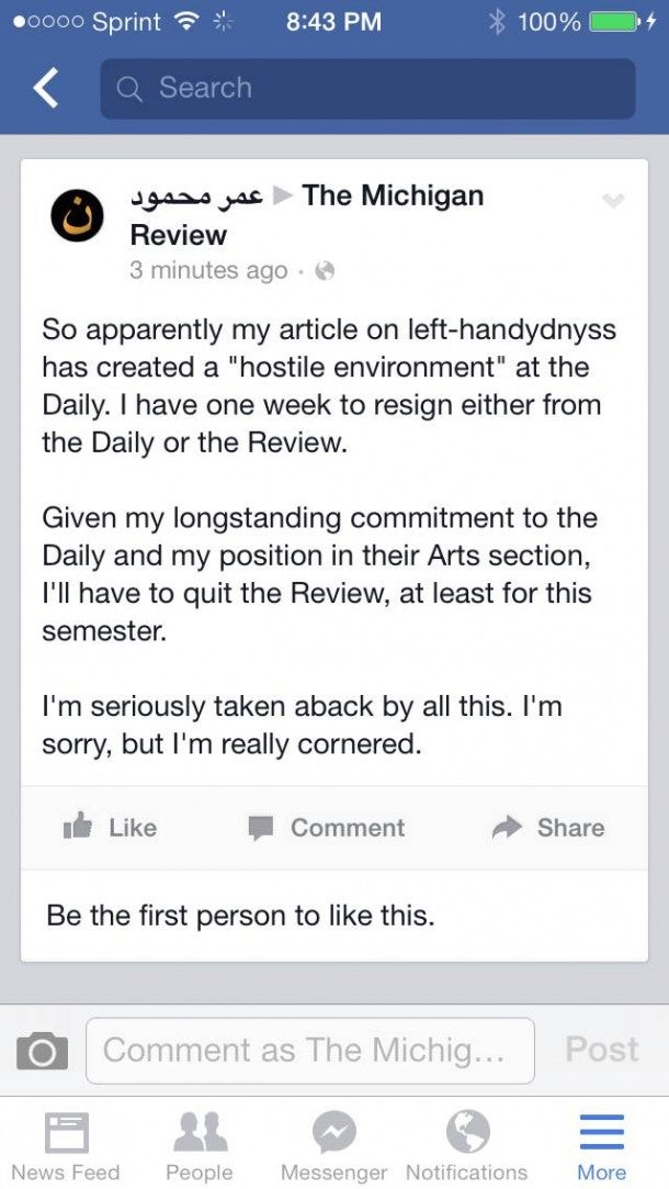 Mahmood recently penned a brief satire of the “check your privilege” fad, claiming (tongue in cheek) that a system of right-handed privilege was oppressing left-handed people everywhere through daily right-handed “micro-aggressions” — a bit of jargon beloved by the progressive “social justice” crowd. The article was humorous, harmless and conservative.