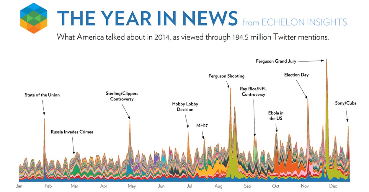 Echelon Insights, a Republican digital and advertising strategy firm, analyzed more than 184 million tweets across 80 different news events, giving insight into the biggest stories of the year. The infographic below tells the story of 2014 on one of the biggest social media platforms.