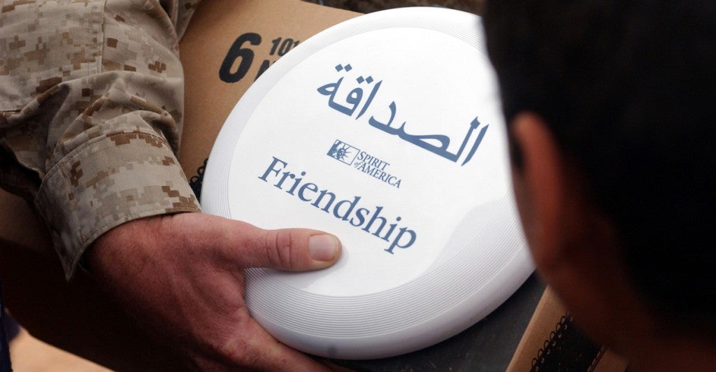 Iraqi children show off their new frisbees given out by U.S. Marines. The frisbees were donated by Spirit of America. (Photo: Cpl. Paula M. Fitzgerald/DOD/ZUMAPRESS/Newscom)