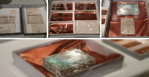 Boston’s Fox 25 called the brass box “crammed” with historically significant items, including newspapers, coins and a silver plaque with fingerprints. One of the coins dates back to the 1650s.
