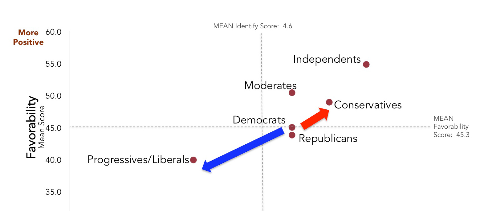 When it comes to the political parties and philosophies, Americans say they are more favorable toward and identify more closely with conservatives and Republicans. Conservatives are seen as lifting the Republican Party, while progressives/liberals are viewed as pulling the Democrat party down.