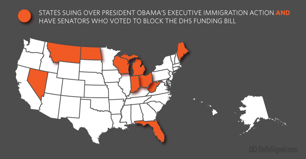 Lawmakers in Florida, Indiana, Maine, Michigan, Montana, Nevada, North Dakota, Ohio, West Virginia and Wisconsin—states that have all signed onto a lawsuit that alleges the president’s immigration plan is unconstitutional—have twice blocked debate on a bill that would fund the Department of Homeland Security while also undoing Obama’s immigration actions.