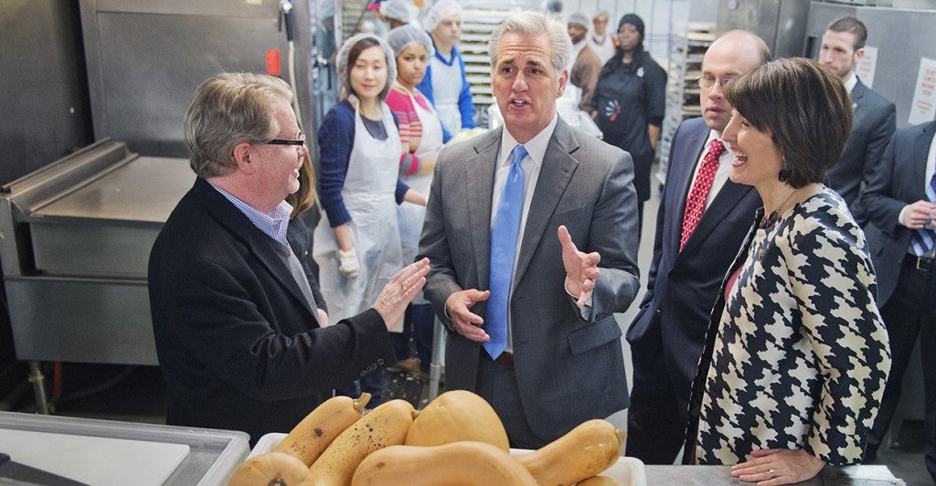 Mike Curtin, left, CEO of DC Central Kitchen, gives a tour of the facility to House Majority Leader Kevin McCarthy, R-Calif., Rep. Jason Smith, R-Mo., and Conference Chair Cathy McMorris Rodgers, R-Wash., in advance of the upcoming vote on the Fighting Hunger Incentive Act, Feb. 10, 2015. (Photo: Tom Williams/CQ Roll Call)