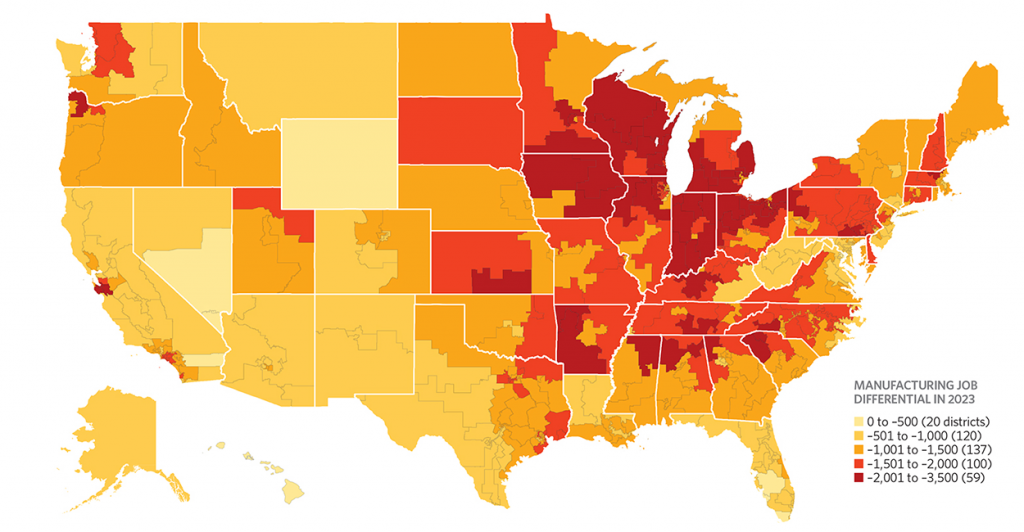 On a local level, 68 percent of U.S. Congressional districts are expected to lose more than 1,000 manufacturing jobs.