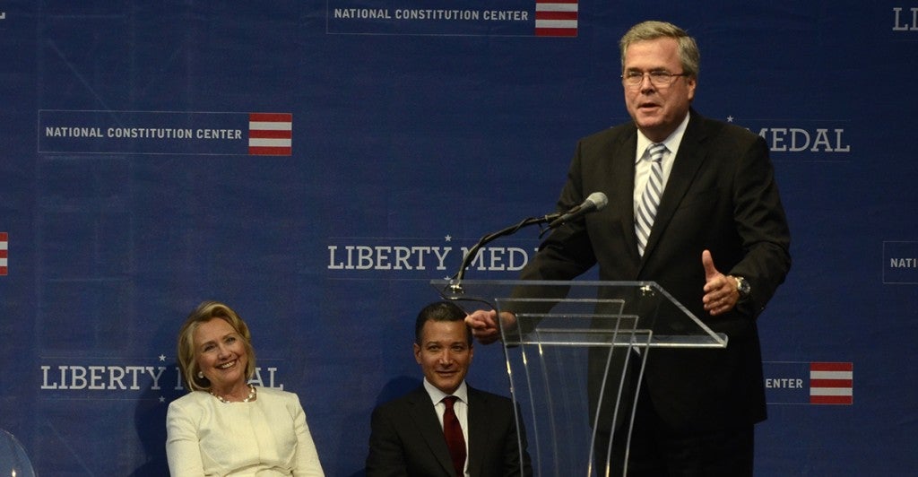 The video includes short clips of Bush and Clinton speaking separately at the 2013 event at the National Constitution Center, where the former secretary of state received the museum’s Liberty Medal.