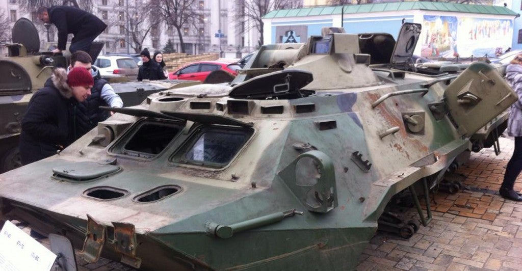 According to the Ukrainian military, the Russian military hardware on display in St. Michael’s Square was captured from pro-Russia separatists during recent battles. The captured equipment is proof, Ukrainian officials claim, of the Kremlin’s complicity in the ongoing conflict.