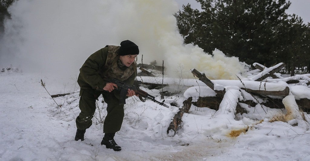 A recently mobilized Ukrainian serviceman exercises during a military training on the Desna shooting range near Kiev, Ukraine, Feb. 13, 2015. (Photo: Sergey Dolzhenko/Newscom)