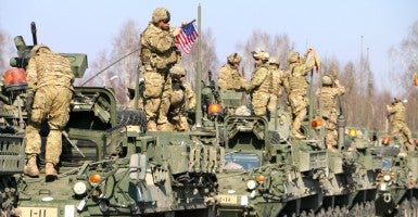 Lithuanians pose with U.S. Army soldiers at a U.S. Army Stryker static display in Marijampole, Lithuania on March 24.(Photo: Nolan Peterson/The Daily Signal)