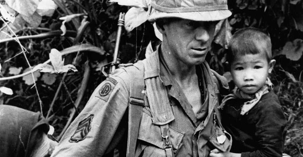An American soldier keeps a young boy and a newborn in his arms. In the background, a truck and other two children behind a barbed-wire fence in Saigon, 1968. (Photo: monhistorypix/Newscom)