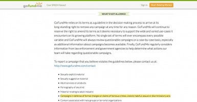 Campaigns created for the benefit of individuals facing formal charges of discriminatory acts, or dealing with the resulting legal ramifications, as determined by local laws within the state in which they reside, will not be permitted to fundraise on GoFundMe.