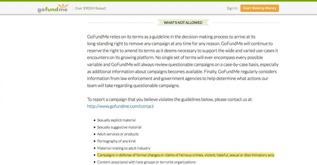 Instead of prohibiting “campaigns in defense of formal charges of heinous crimes, including violent, hateful, or sexual acts”—as it used to—GoFundMe now bans “campaigns in defense of formal charges or claims of heinous crimes, violent, hateful, sexual or discriminatory acts.”