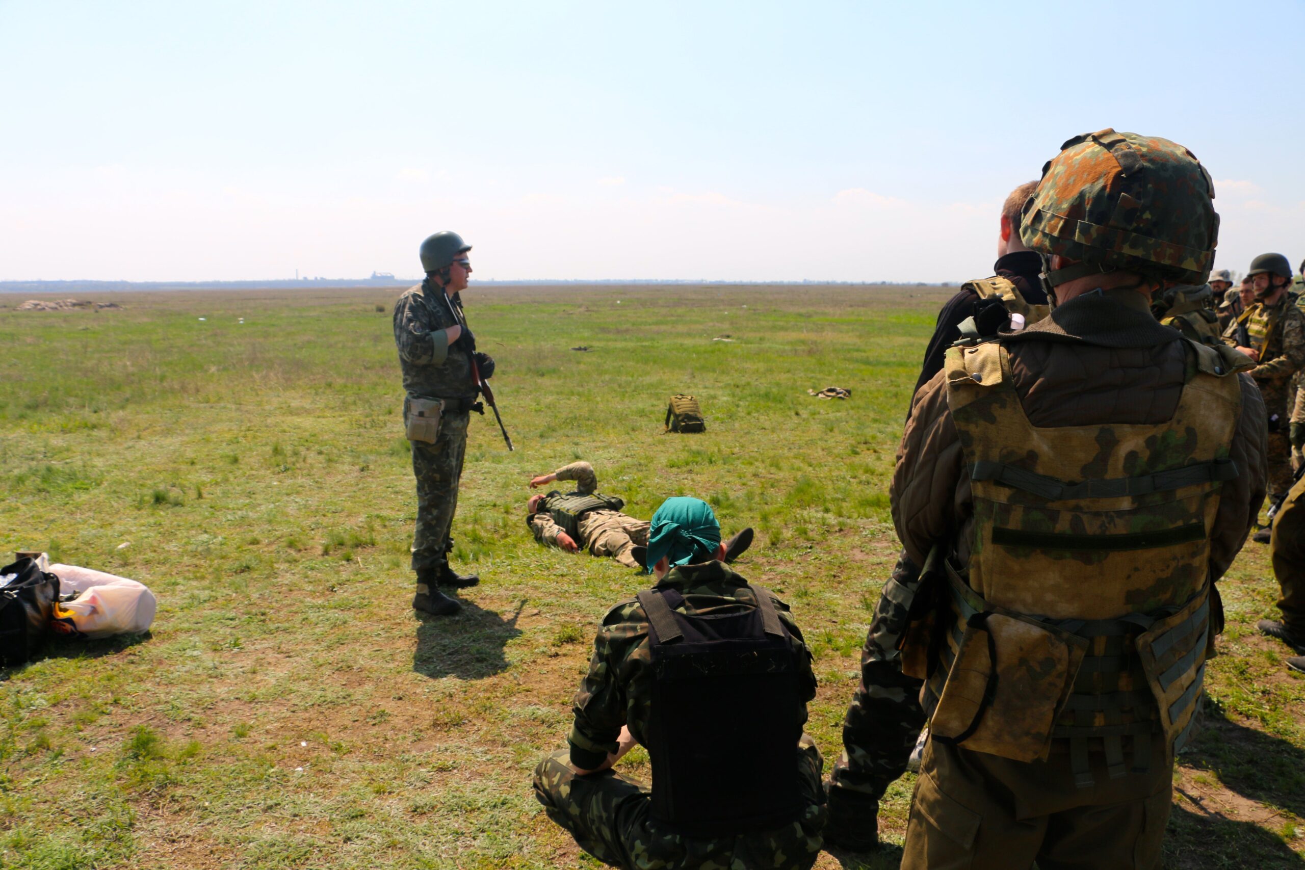 In a wide-open field on the Ukrainian steppe on a hot, end of April afternoon, about 30 soldiers of the regular army’s 46th Battalion Donbas are training in Tactical Combat Casualty Care, or TCCC.