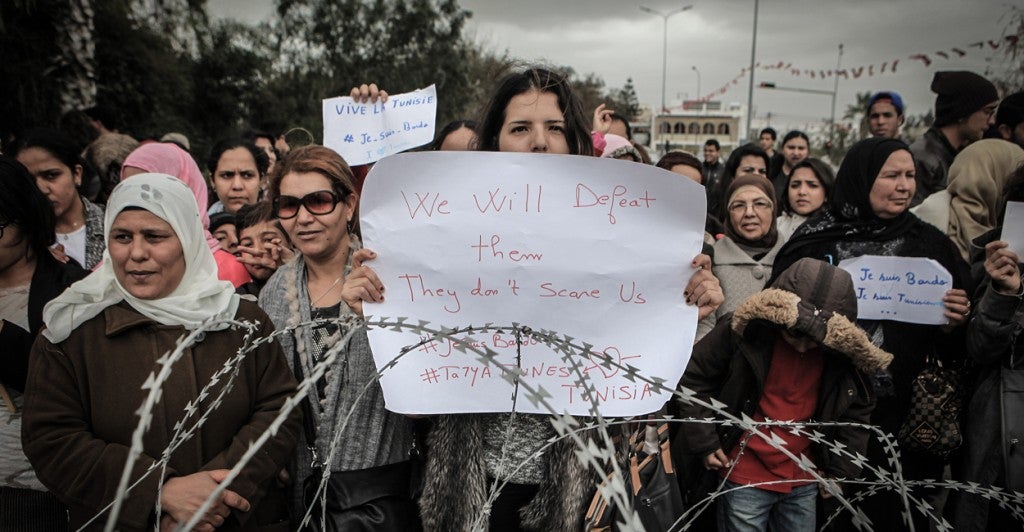Demonstrators protest outside Tunisia's Bardo National Museum in Tunis, condemning the attack on the tourist site in March that killed 21 people. (Photo: Ileyes Gaidi/ZUMA Press/Newscom)