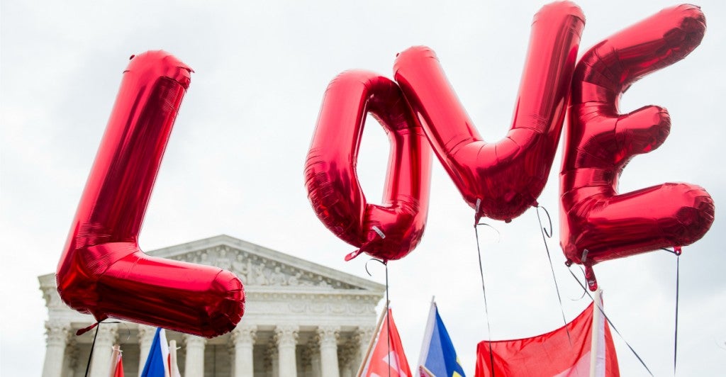 Same-sex marriage proponents celebrate in front of the court on Friday, June 26, thanking the author of the majority opinion, Justice Anthony Kennedy. (Photo: Pete Marovich/UPI/Newscom)