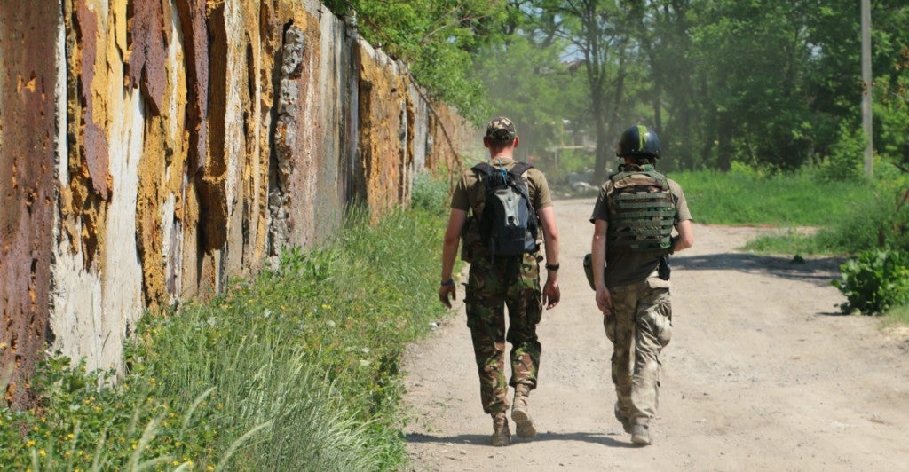 Vasiliy Ivaskiv, 53, (right), and another soldier on patrol in Pisky (Photo: Nolan Peterson/The Daily Signal)