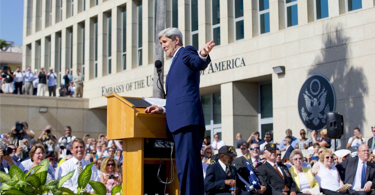 Kerry highlighted opponents' concerns during the ceremony, calling for a “genuine democracy” in Cuba that includes free elections, freedom of religion and speech, and human rights improvements.