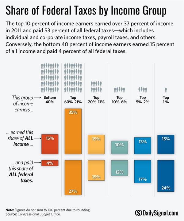 When looking at the shares of taxes that the various income groups pay as shown in Chart 2, it becomes even clearer how much more the wealthy pay. For instance, the top 10 percent of income earners pay 53 percent of all federal taxes while earning 38 percent of all income. The middle 40 percent, a group four times larger, paid 27 percent of all federal taxes while earning 35 percent of the income.