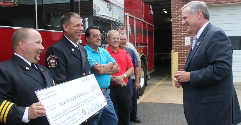 Meadows presents a $153,881 grant from the Federal Emergency Management Agency to George Hildebran Fire and Rescue. “We got your back,” Meadows says. (Photo: Josh Siegel/The Daily Signal)