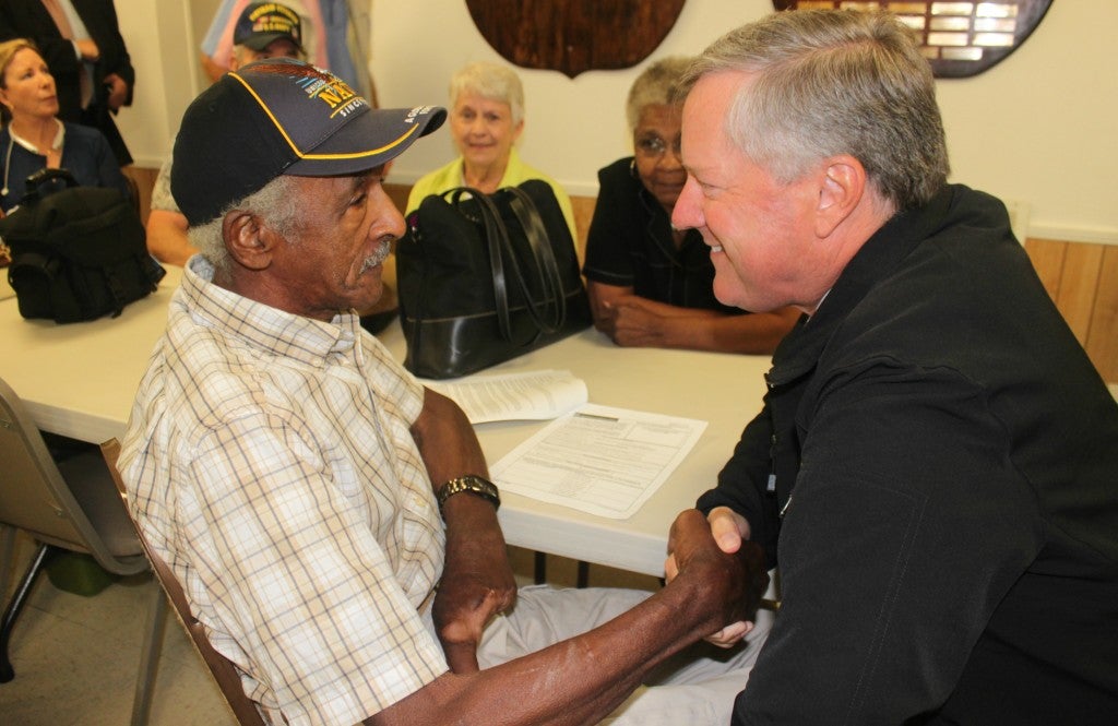 Meadows, sharing a moment with a veteran in Marion, N.C., is the son of a military father and was born at a U.S. Army hospital in Verdun, France. (Photo: Josh Siegel/The Daily Signal)