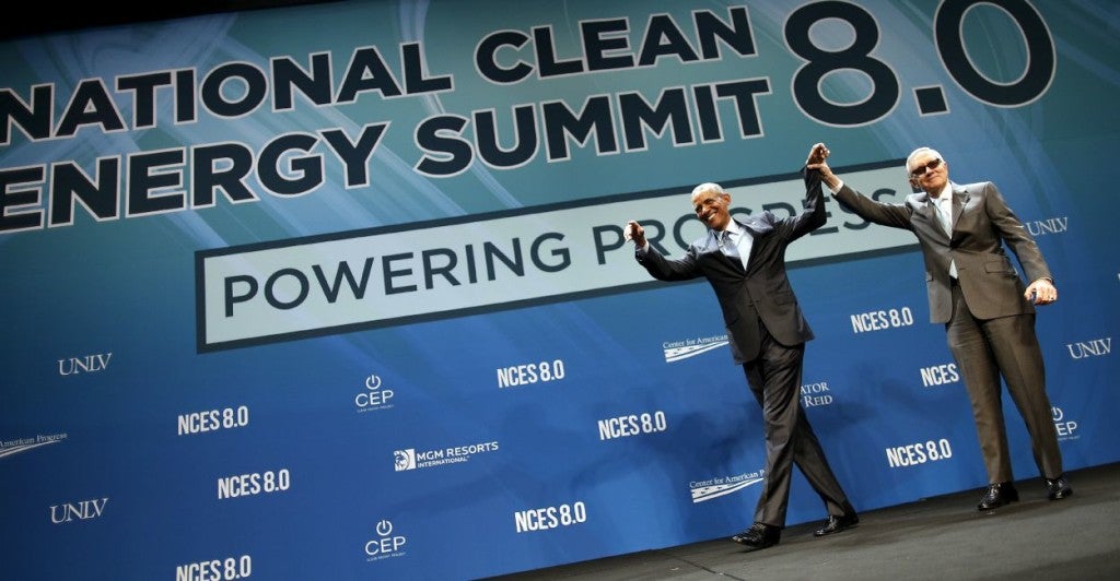 Obama told a crowd in Las Vegas that solar and renewables now make economic sense and blasted conservative think-tanks for being insincere when it comes to the free market. He said, “Now, it’s one thing if you’re consistent in being free market. It’s another thing when you’re free market until it’s solar that’s working and people want to buy and suddenly you’re not for it any more.”