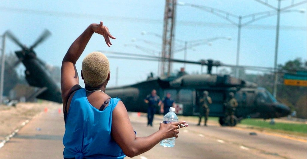 Coast Guard Petty Officer Scott Rady gives the signal to hoist a pregnant woman from her apartment. Rady is a rescue swimmer sent from Florida to help aid in search and rescue efforts in the wake of Hurricane Katrina. (Photo: NyxoLyno Cangemi/U.S. Coast Guard/ZumaPress/Newscom)