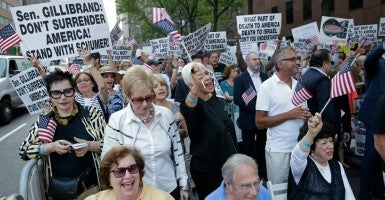 Thousands of protesters poured into Manhattan Tuesday evening to demand, outside Sen. Kirsten Gillibrand’s New York office, that Congress vote against the Iran nuclear agreement.