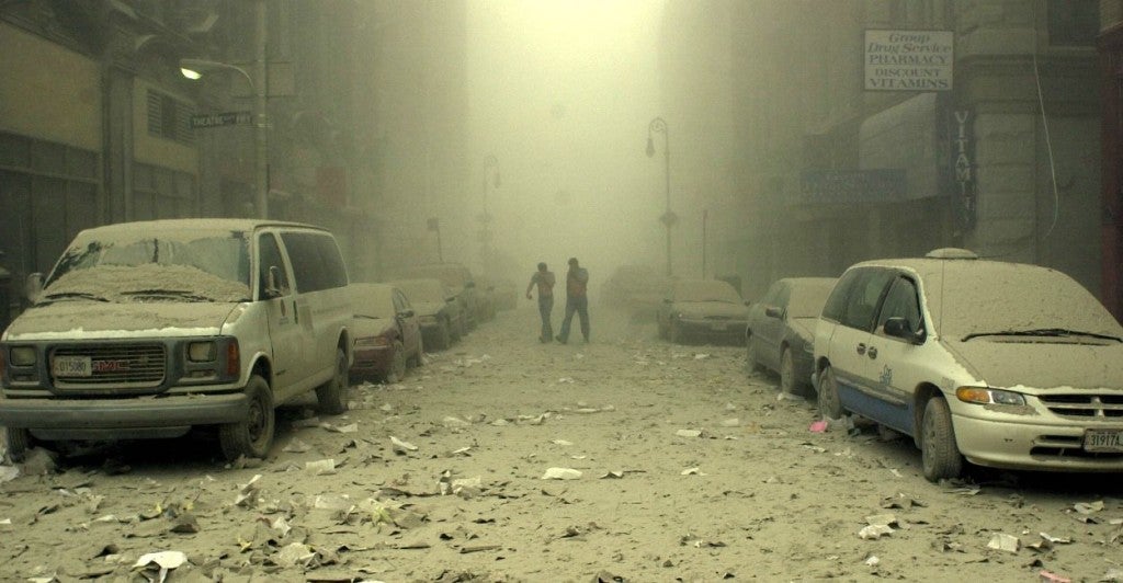 Evacuees walk through the streets in a daze. Those that escaped the attack frightened, only covered in ash while others emerged bloodied and wounded. (Photo: Black Star/Lisa Quinones/Newscom)
