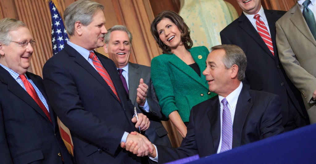 Speaker John Boehner shakes Sen. John Hoeven’s hand after signing his bill to to approve the Keystone XL pipeline project. (Photo: Caleb Smith/Flickr/CC BY-NC 2.0)