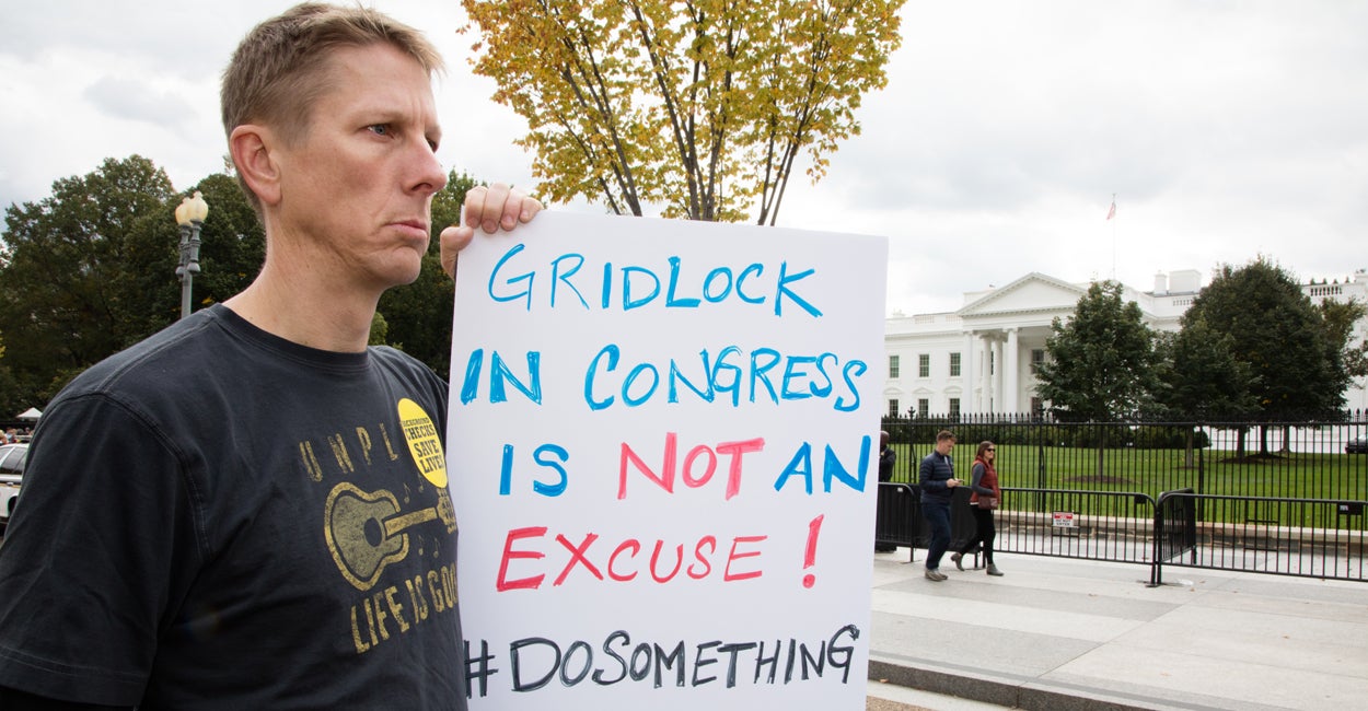 First highlighted by the New York Times last week, the rally gathered three-dozen protesters outside the White House’s East Lawn. The group prayed, chanted, and read names of mass-shooting victims.