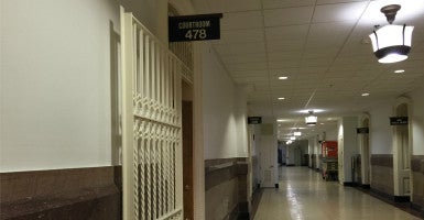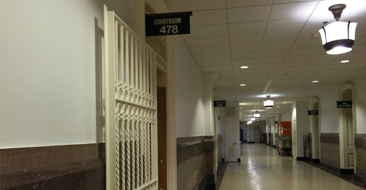 On a Thursday morning in July, the dimly lit hallway is nearly empty. A man passes by, his footsteps echoing, and he ducks into another courtroom further along.